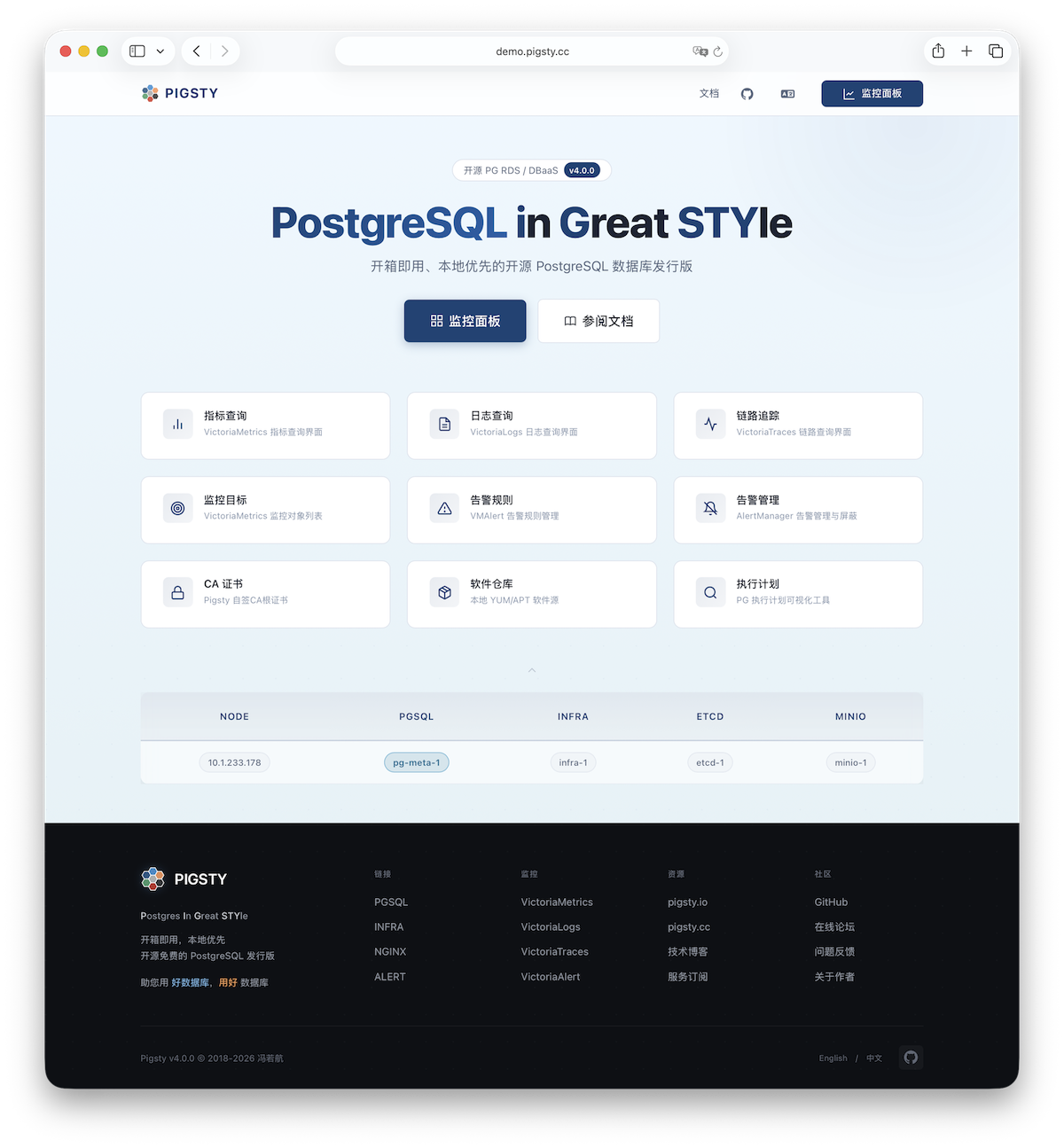 本文是 Pigsty 单节点安装指南,生产环境的多节点高可用部署请参考 部署 文档。